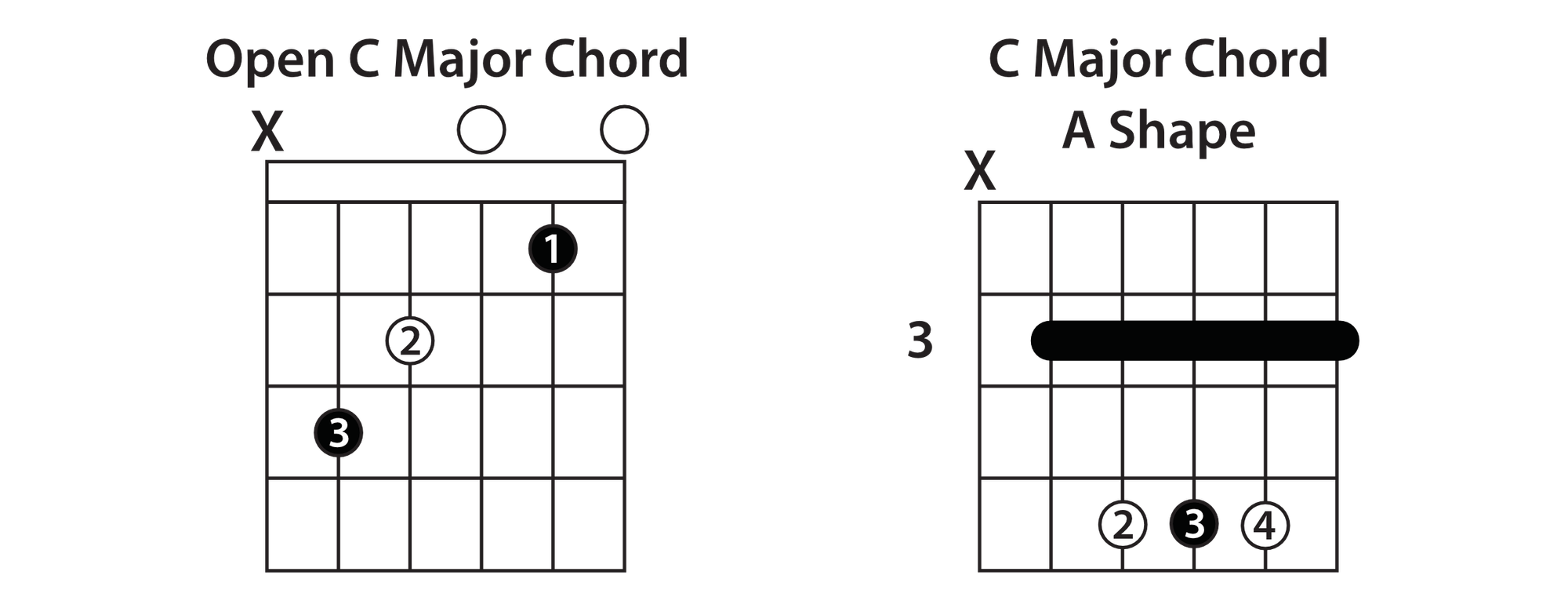 By learning these major and minor barre chord shapes on both the 6th and 5th strings, you can play almost any major or minor chord.