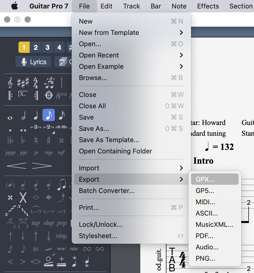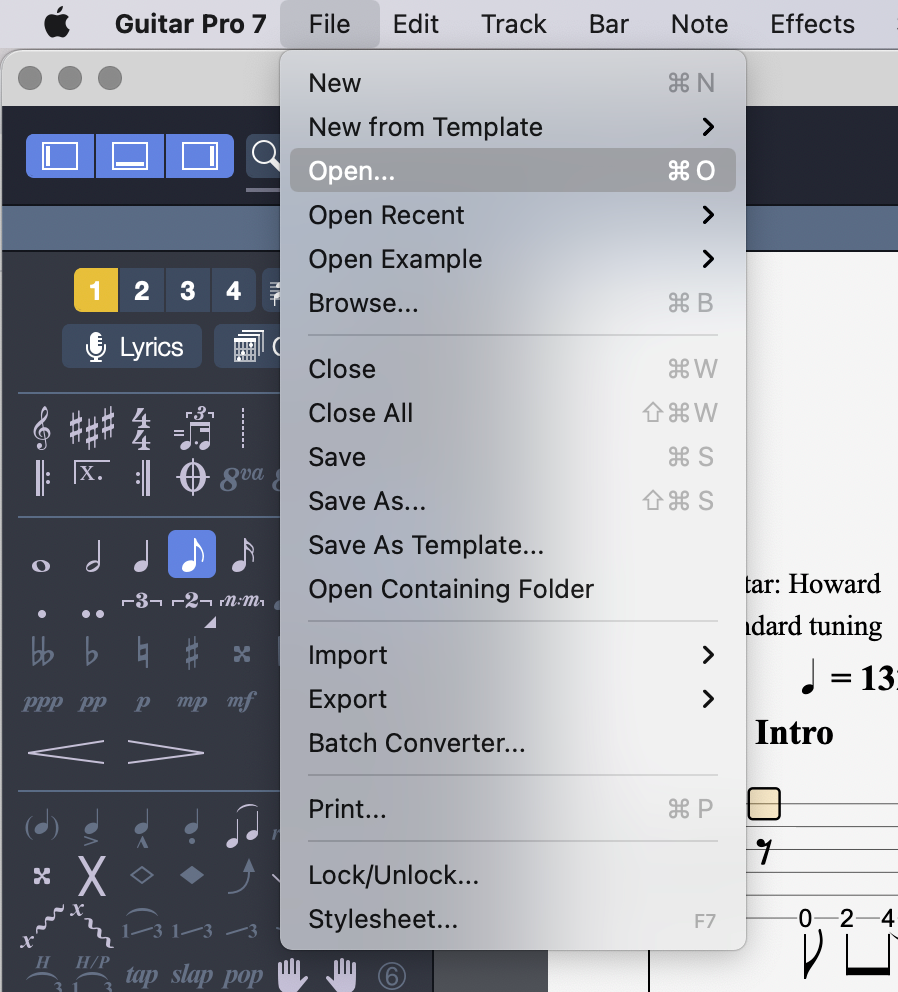 First of all open Guitar Pro 7 / 5 and on the upper menu click File -> Open and choose your guitar pro tab.