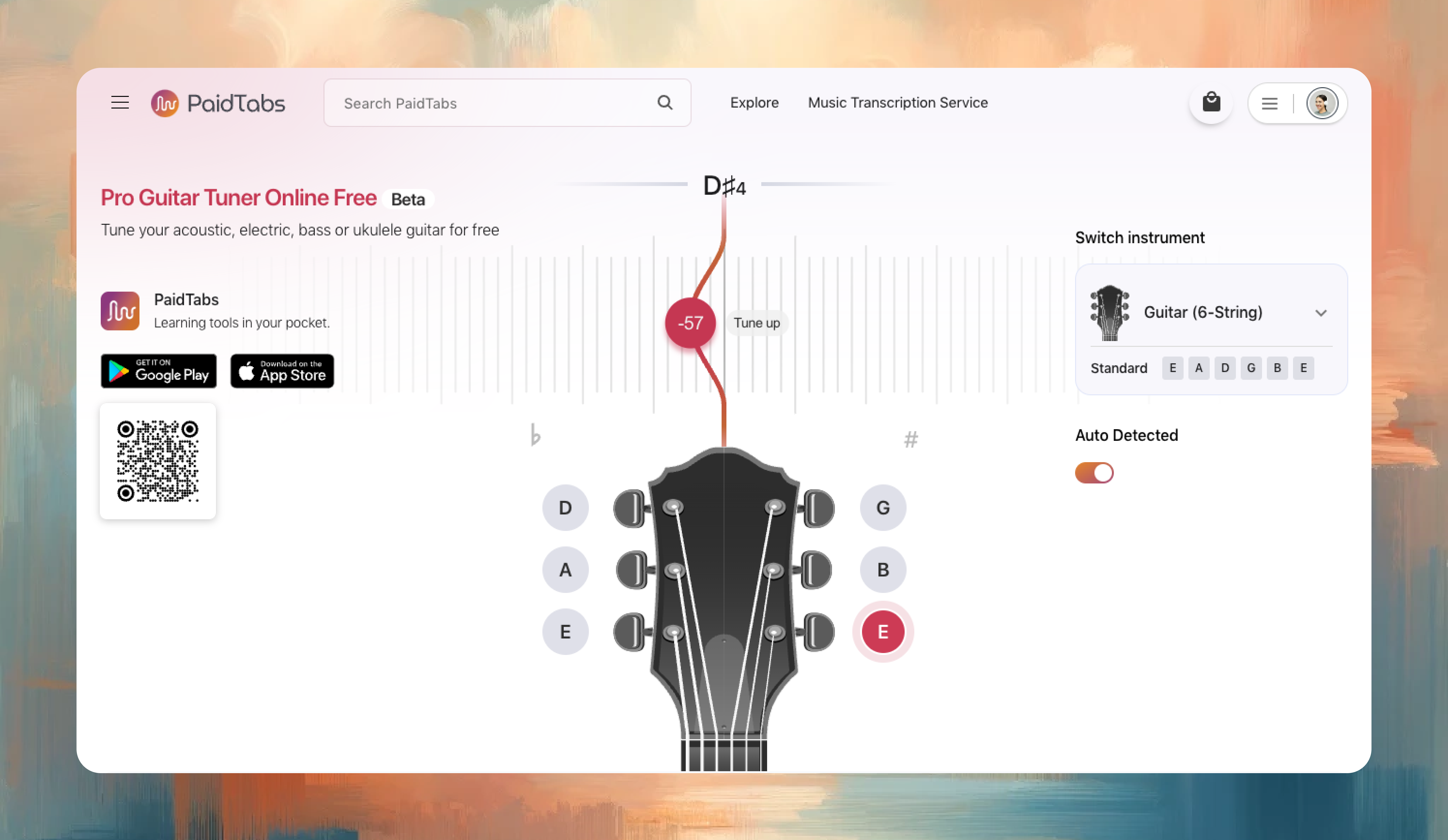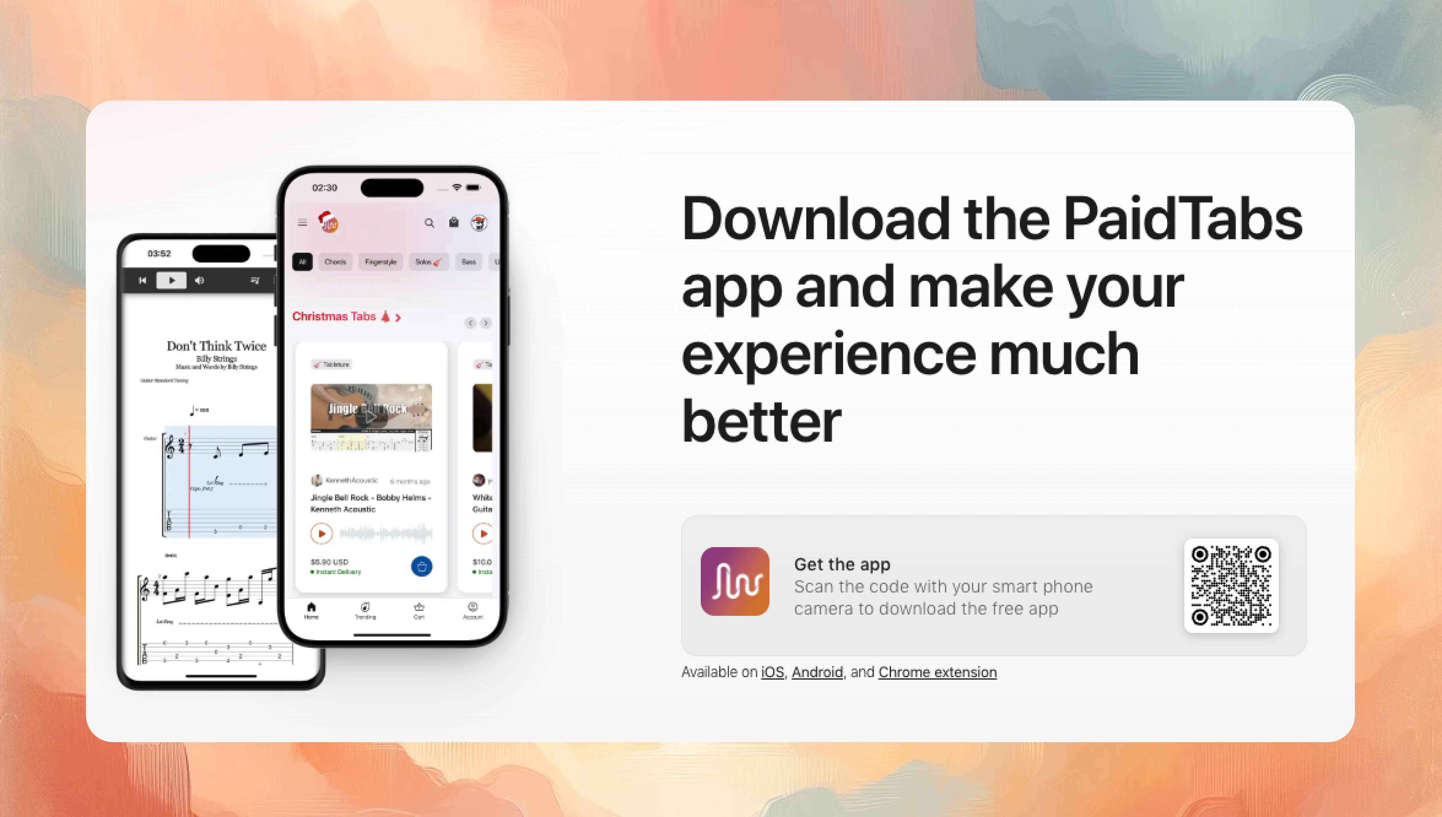 Enjoy free access to our suite of tools, including an interactive player, guitar tuner, and transcription requests, all conveniently in your pocket. Learn more