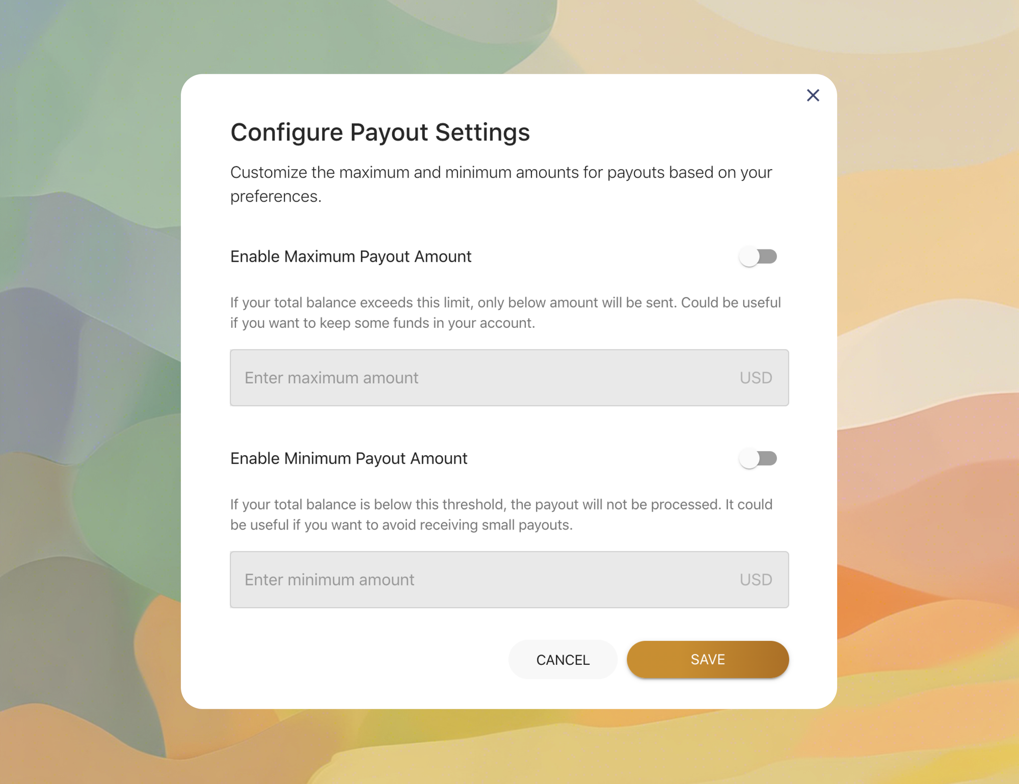 Set your preferred minimum and maximum payout amounts. If you prefer not to receive payments below a certain amount, like $2000, or if you want to cap your payouts at $5000, we’ve got you covered. Any remaining balance stays in your PaidTabs account for the next scheduled payout.