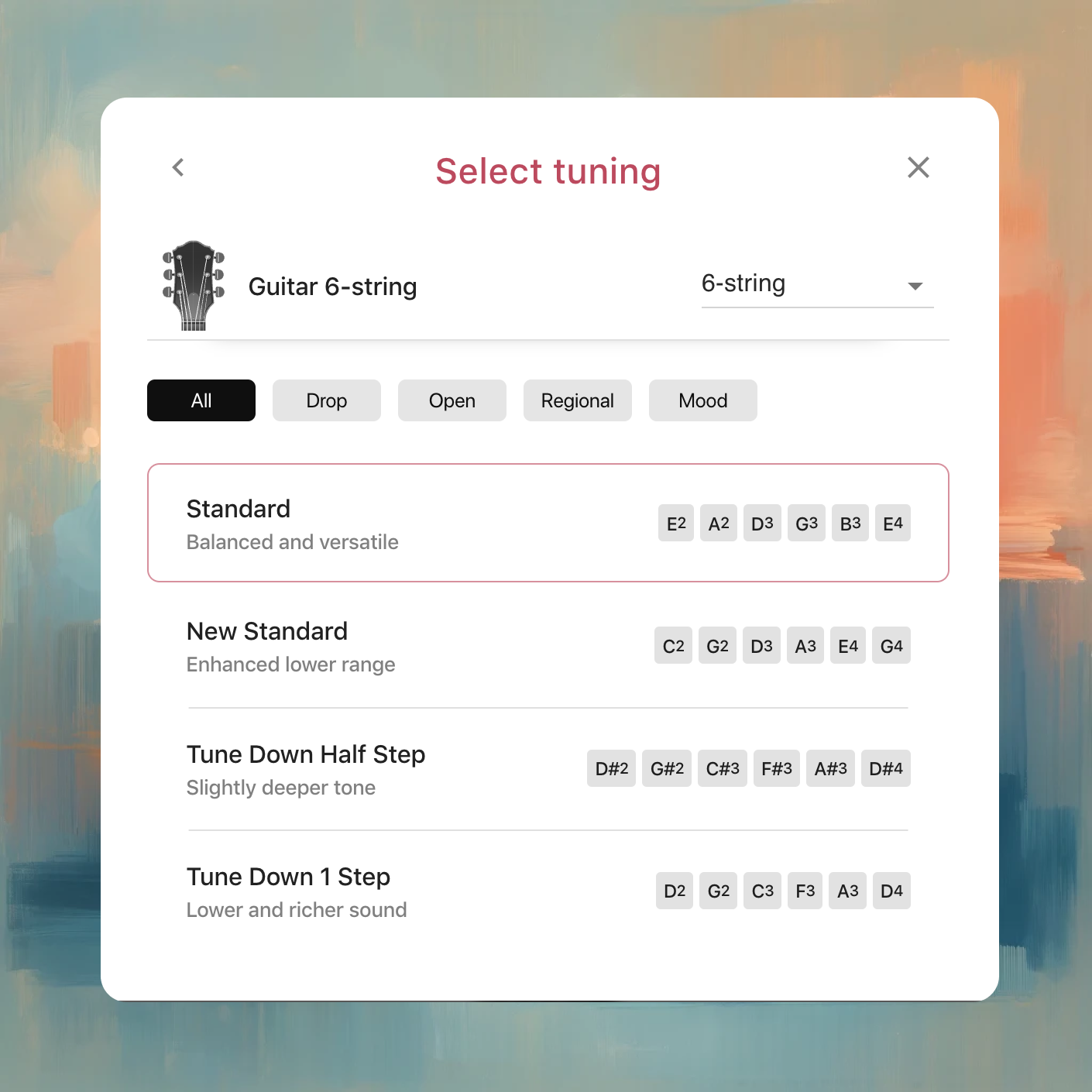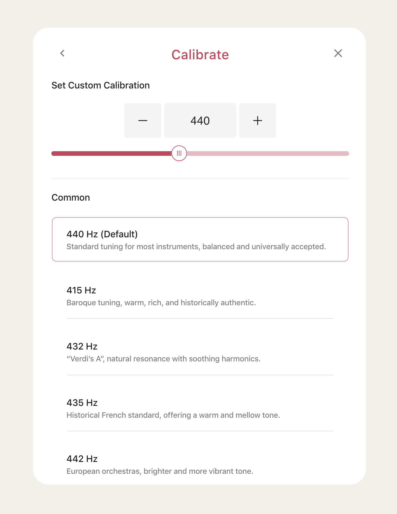 Each instrument comes with carefully calibrated presets, so you're always just one tap away from perfect tuning.