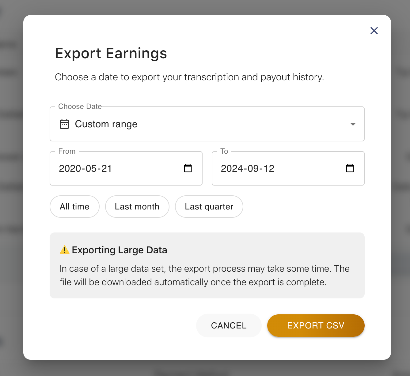 Keep track of your payouts and transcriptions easily. You can now export detailed reports in CSV format, making it perfect for staying organized or handling taxes.