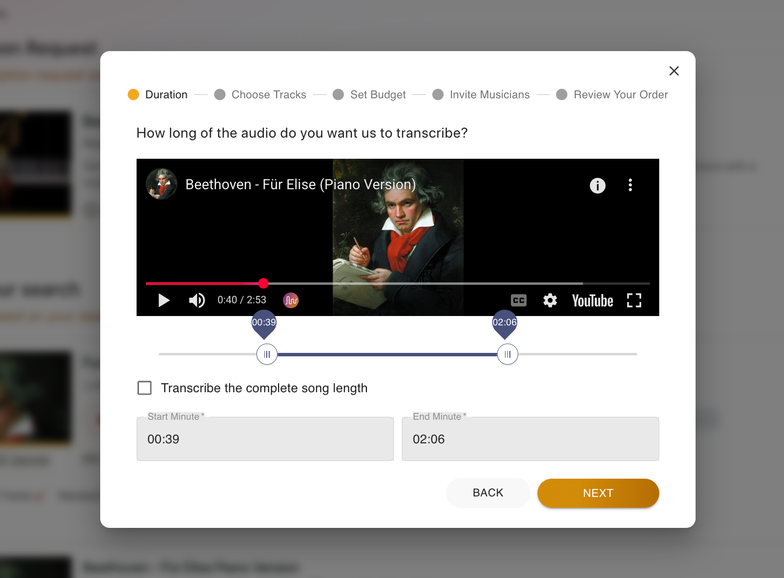 Choose whether you want the entire song transcribed or just a section by setting start and end times.
