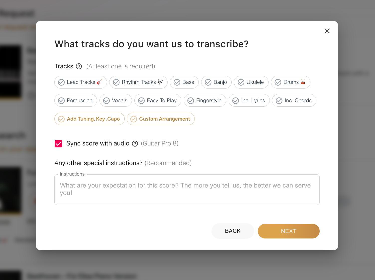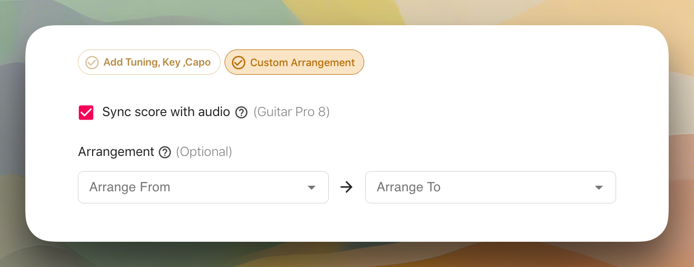 Select this if you want the music adapted for a specific setup or instrument, for example, if the original piece is for guitar but you want it transcribed for violin instead.