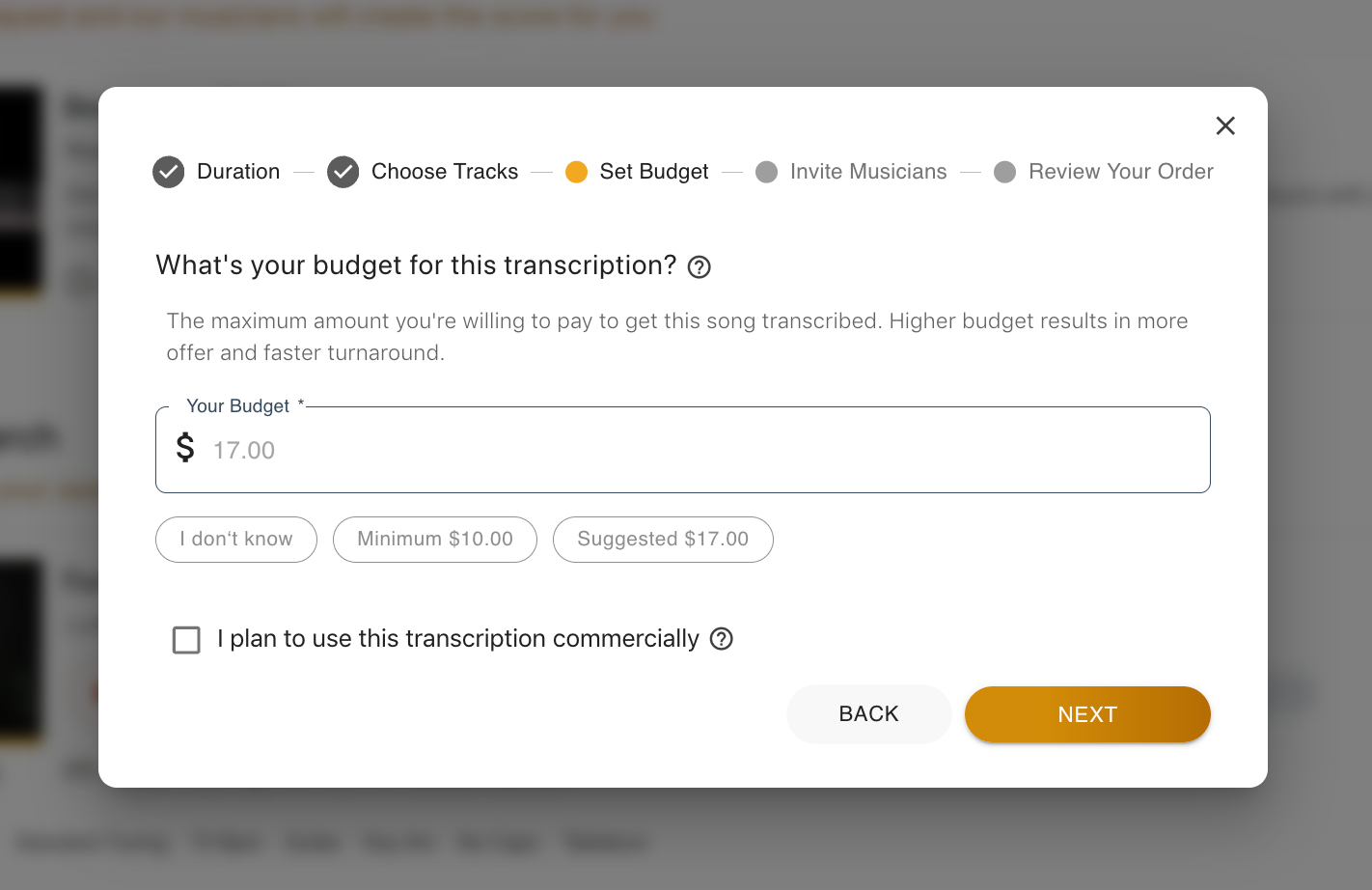 Set your preferred budget, the system suggests a minimum and recommended price based on song length and complexity.