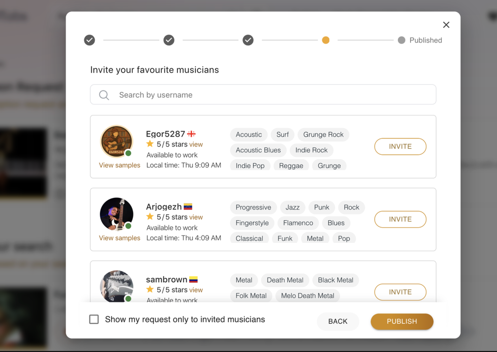 You can invite specific transcribers or make your request public. Each musician profile includes:
